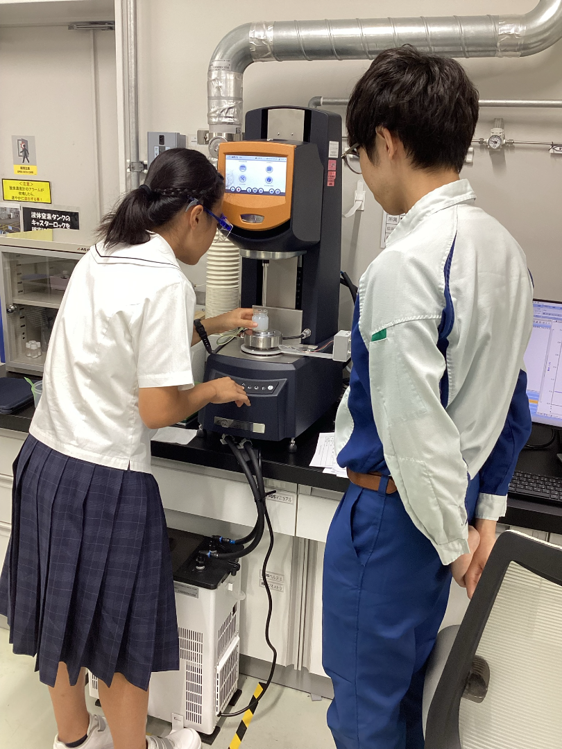 当日は、まず東亞合成株式会社の概要について説明を受けた後、研究所の測定機器を用いて実験を行いました。デンプンゲルの研究では、異なるpH条件で作成したサンプルの強度を測定し、レジンの硬化実験では、着色剤の色や量によって硬化時間がどのように変化するかを調べました。生徒たちは当初緊張していましたが、研究員の方々の丁寧なご指導により、落ち着いて測定を行うことができました。