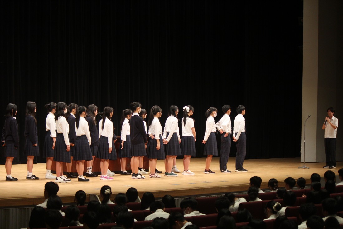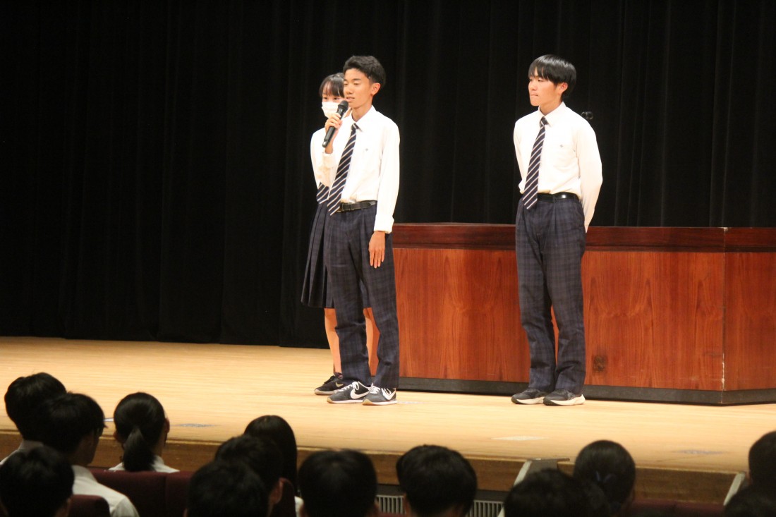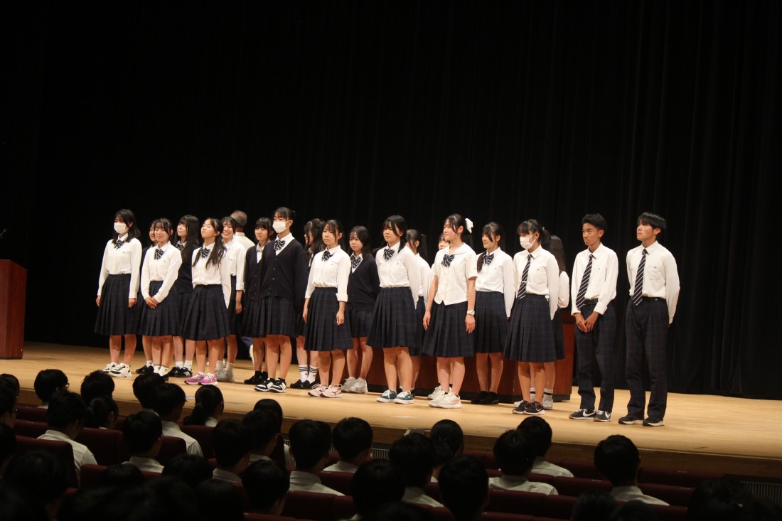 9月30日(火)、令和7年度前期終業式、表彰式、壮行会を行いました。今回は文化行事終了後に行ったため、四日市文化会館にて行いました。