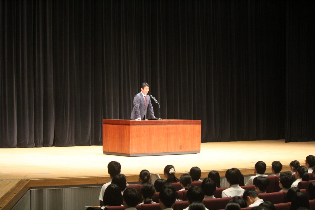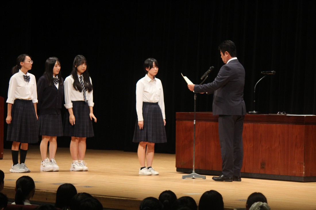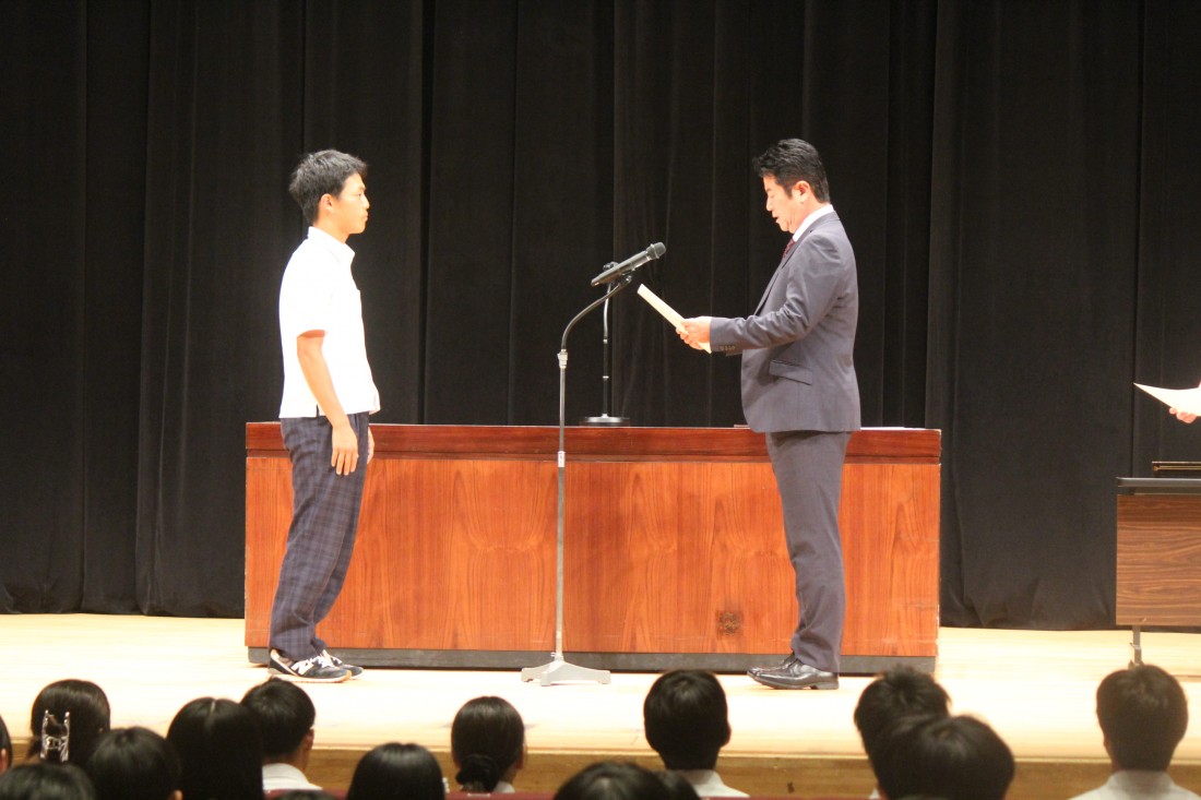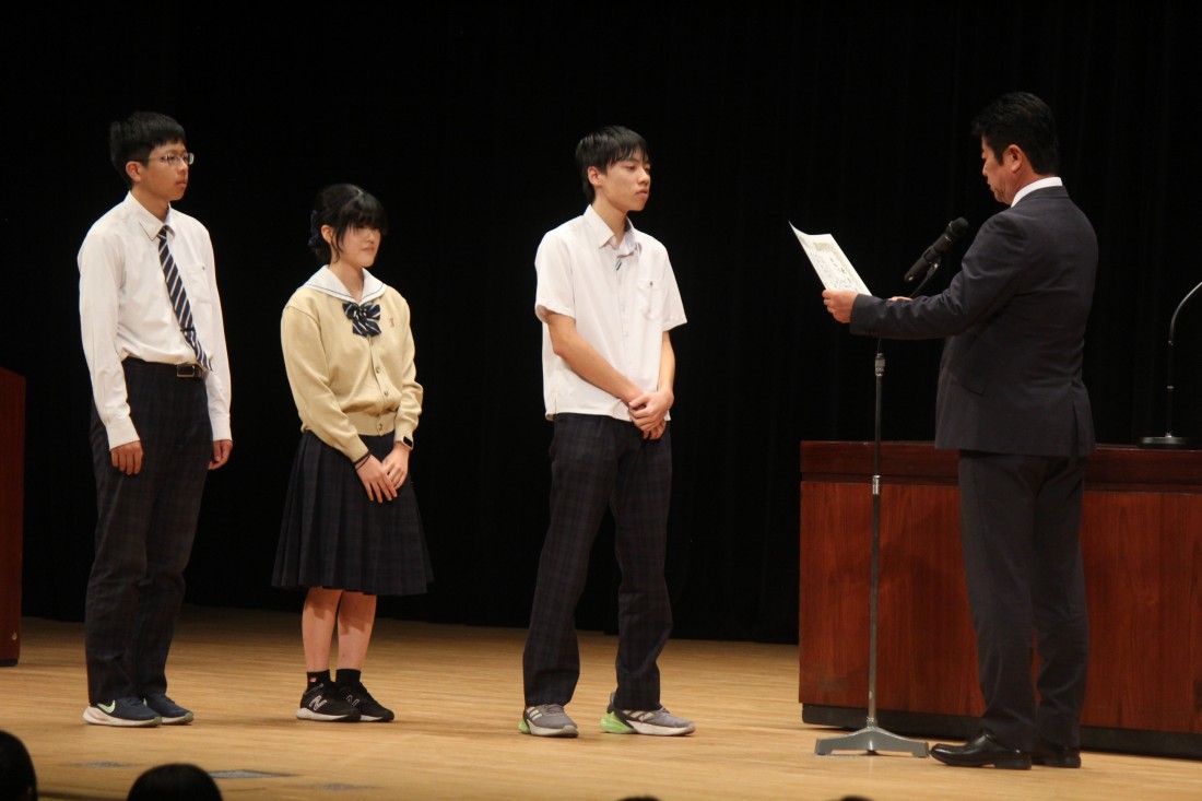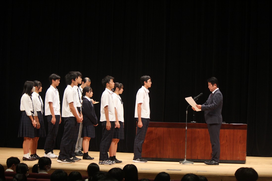 まず初めに、表彰式を行いました。硬式野球部、テニス部、バドミントン部、陸上競技部、水泳部、バトン部、SSH生物部の生徒、SSH発表会参加生徒、クイズ選手権出場生徒等、たくさんの生徒が表彰を受けました。