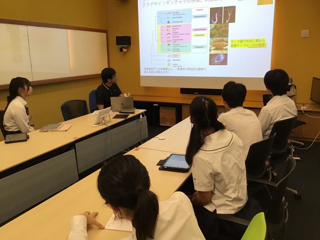 午前は、將口栄一博士によるCareerTalkの後、褐虫藻のゲノム解読についてScienceLectureを受けました。LabTourでは、將口博士の研究室を中心に、顕微鏡などの最新機器などを見学させていただきました。