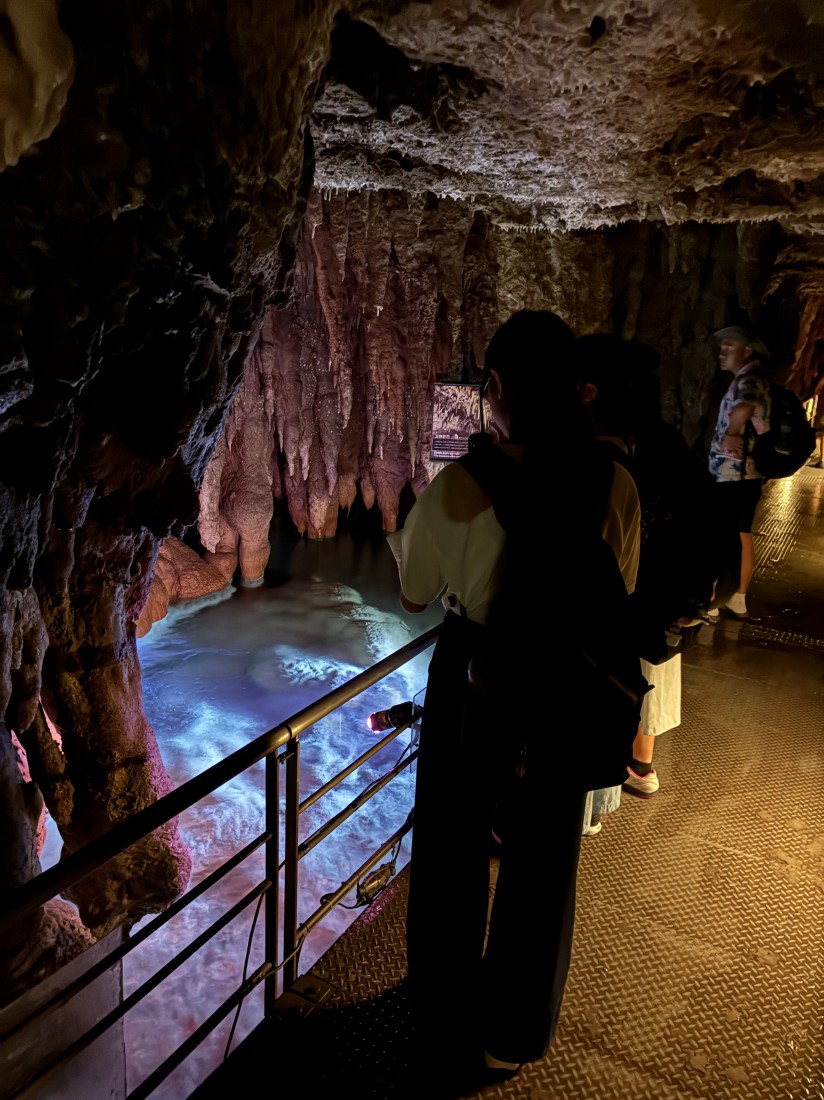 ・巨大な鍾乳石を多く見かけましたが、その多くが落ちてくる地下水の炭酸カルシウムによってできていることを知って自然の神秘を感じました。通路の上にも既に石筍ができ始めていて、自然の力は人間のそれを凌駕しているのが改めて感じられました。