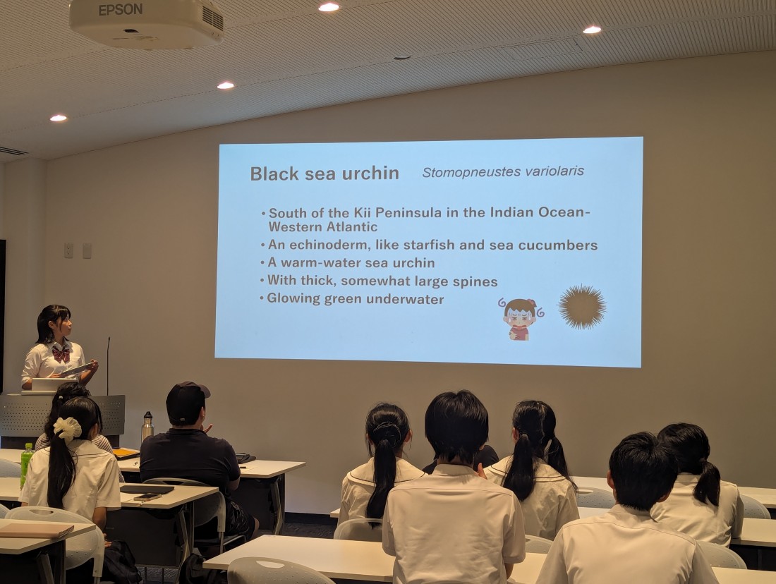 ・午前中に口栄一様より褐虫藻についてご講演いただきました。これまで動物学で学んだ内容以上に詳しくご説明くださり、理解が深まるとともに、人間の活動がサンゴや生態系全体に大きな影響を与えていることを実感いたしました。