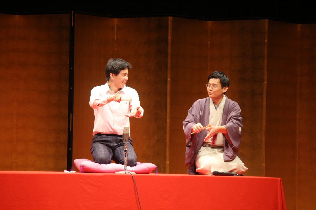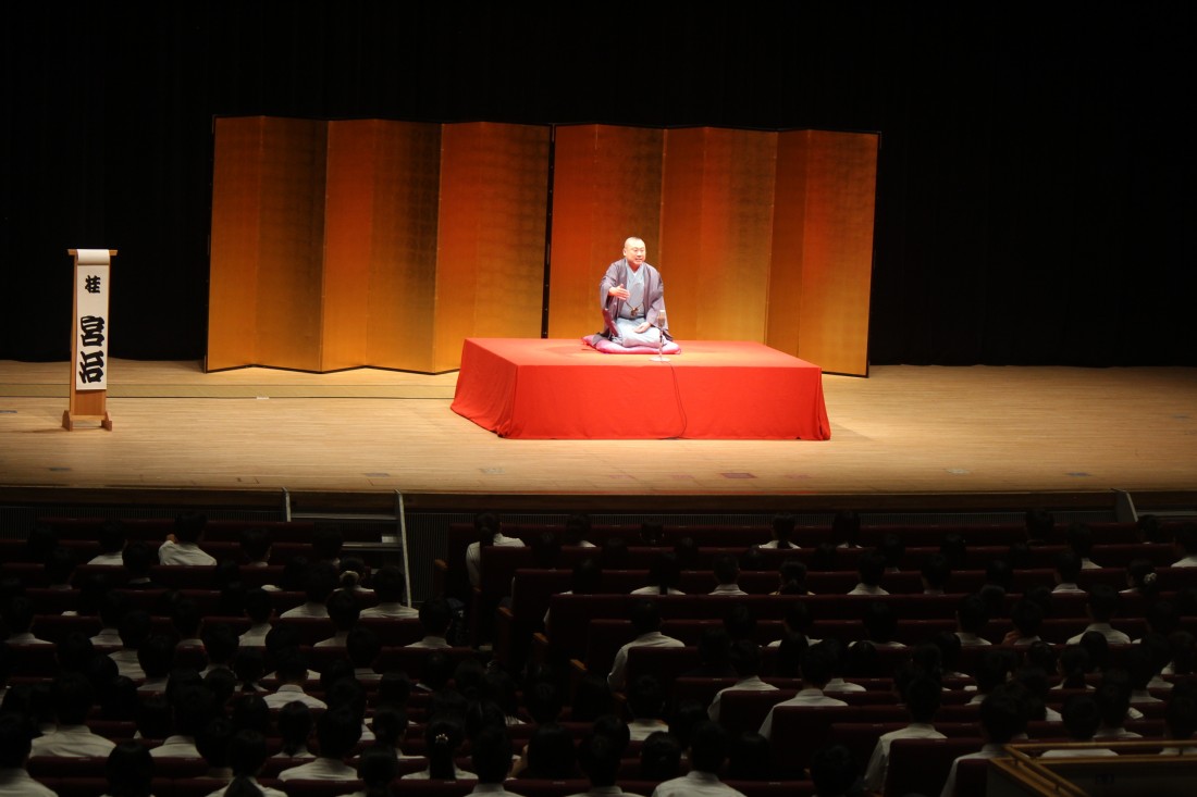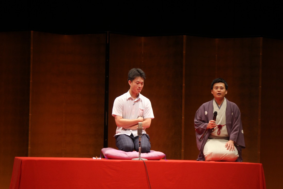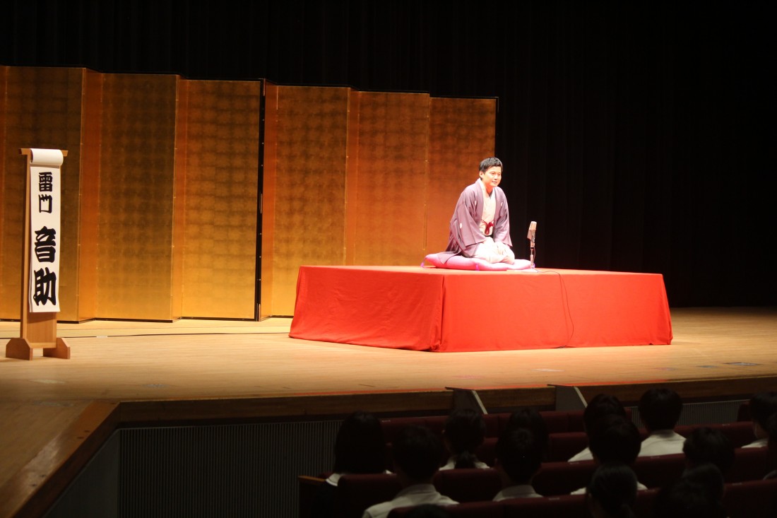 はじめに、雷門音助さんによる落語解説がありました。声の調子や扇子・てぬぐいの使い方の工夫など落語のテクニックを実演しながら教えていただきました。最後には3年生の3名の生徒が高座で実践もさせていただき、会場は大いに盛り上がりました。