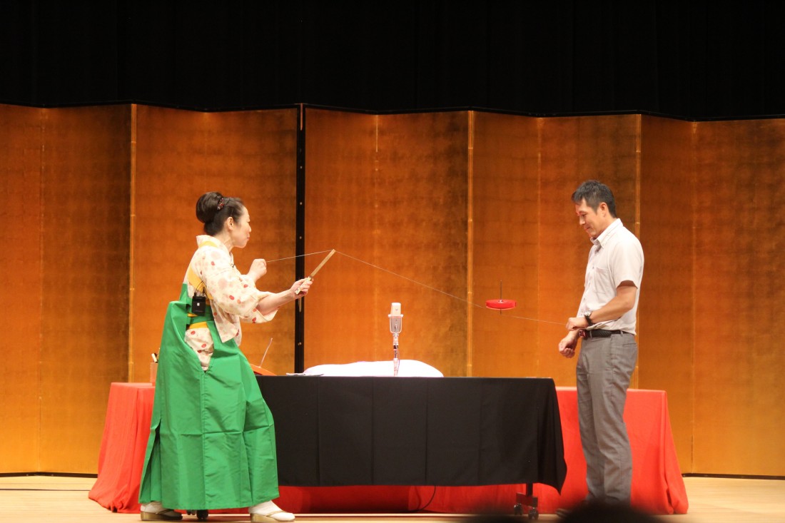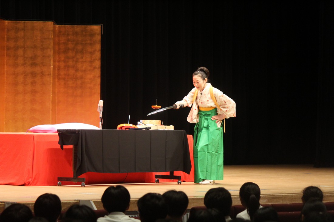 次に三増れ紋さんによる江戸曲独楽を鑑賞しました。大きな独楽が扇子や刀、糸の上で回る様子に会場からは驚きと感嘆の声が上がりました。教員1名も独楽回しを体験させていただきました。