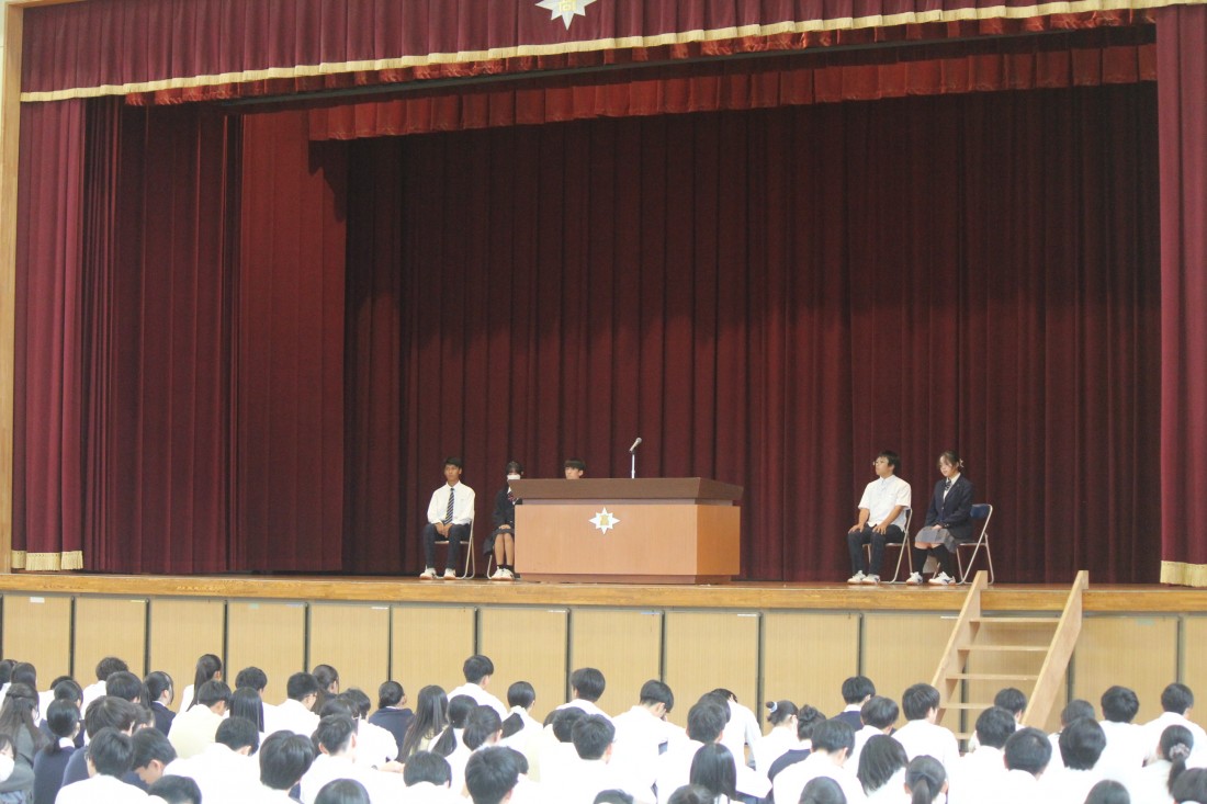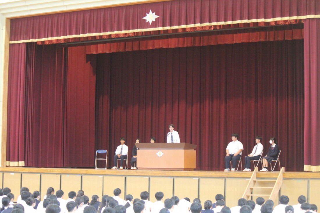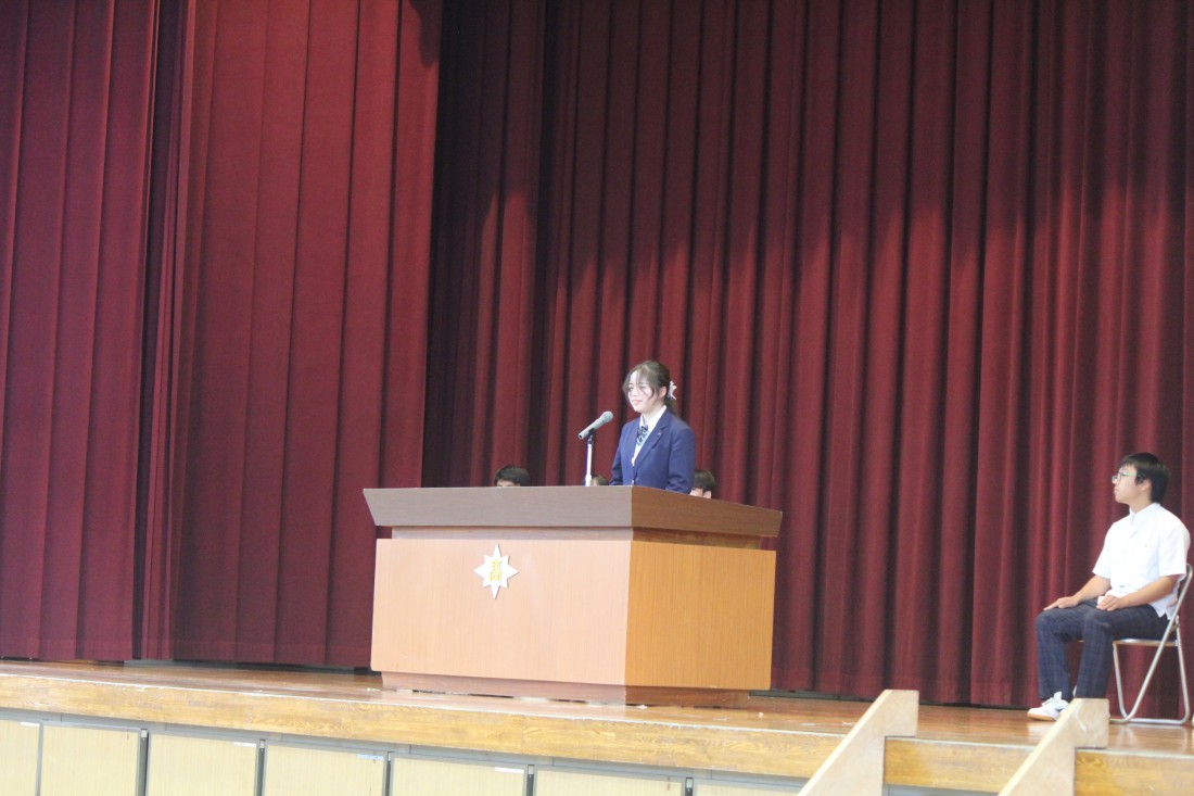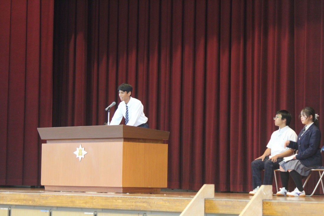 まず、前期生徒会役員から退任の挨拶があり、その後、後期生徒会役員候補者が演説を行いました。