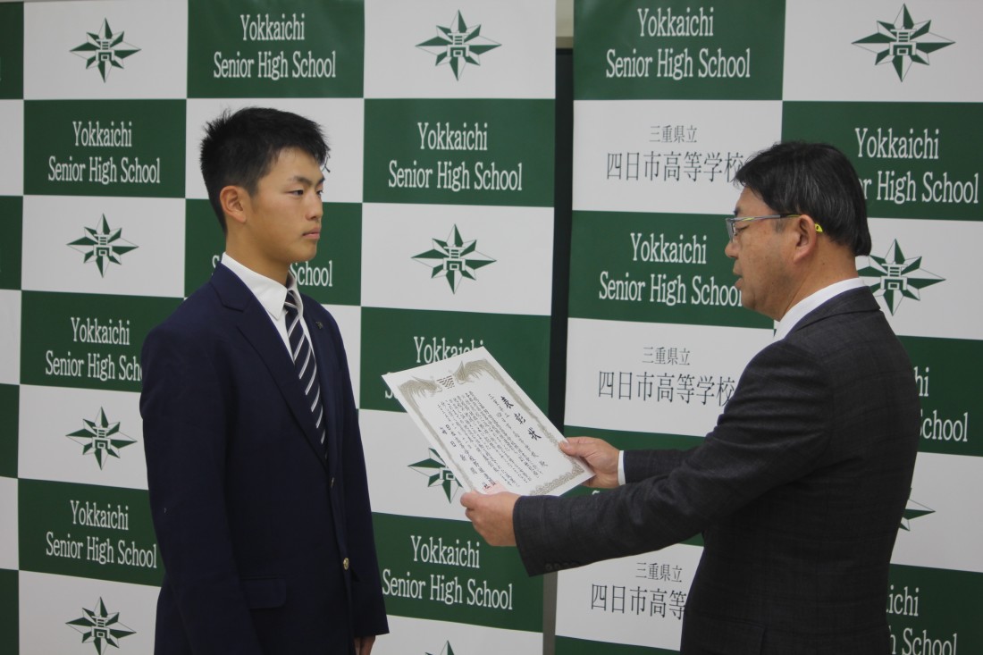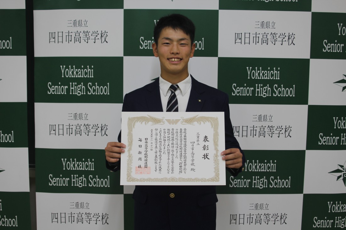 本校野球部が、第98回選抜高等学校野球大会(通称:センバツ)における「21世紀枠」の三重県の候補校として一般財団法人三重県高等学校野球連盟から推薦され、その伝達式が行われました。今秋の県大会で4強に進出したことに加え、学業と部活を両立させていることなどが評価されました。