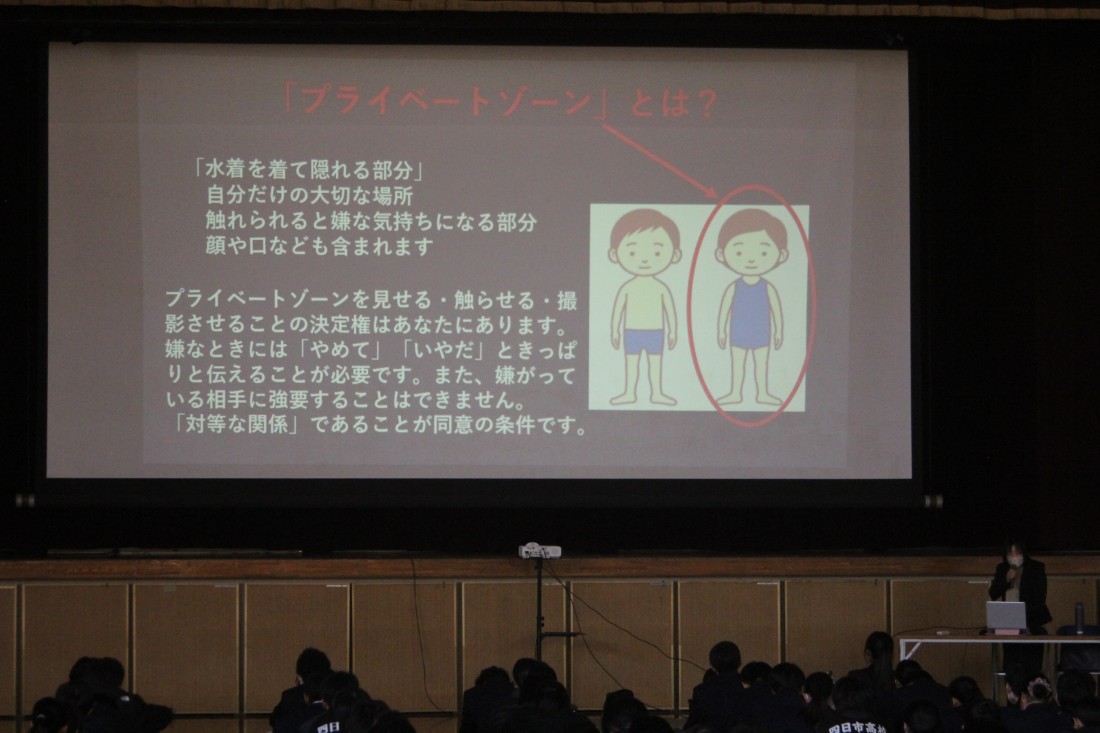 コミュニケーションとは同意で成り立っているものであり、お互いが対等の関係にあることが重要であるということ。また、性暴力について、被害者にも悪いところはある、といった認識は間違っている、ということ。身近に潜んでいるかもしれない薬物の危険性、インターネット・SNSでも「境界線」は必要であることなど、身近な人間関係にまつわることから今後出会う可能性のある危険なことまで、かけがえのない生命を守るための様々なお話を、丁寧に優しくご講義いただき、生徒は真剣な表情で聴き入っていました。