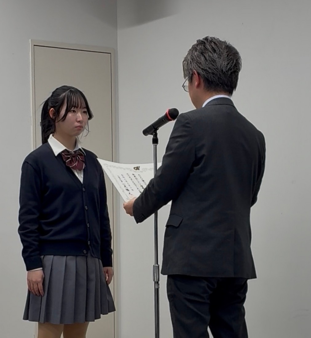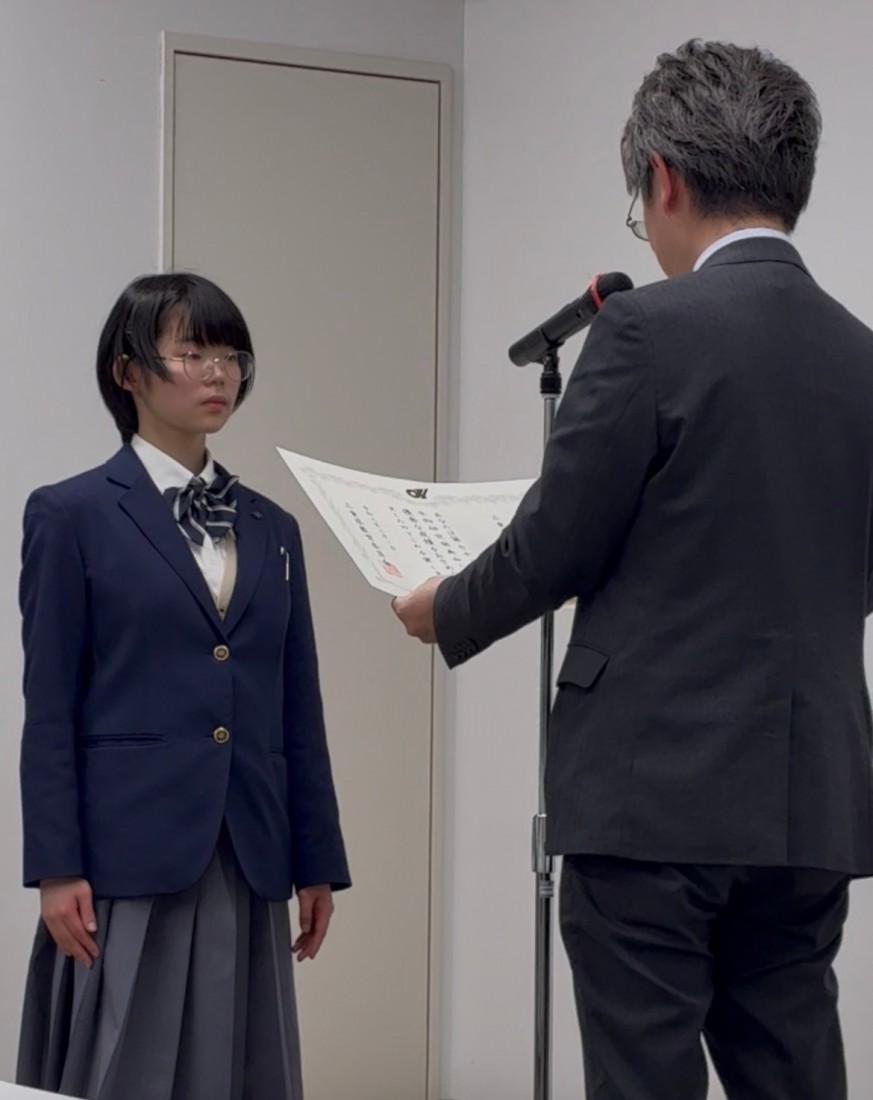 その成果が高く評価され、小塚さんは最優秀賞に相当する「知事賞」を受賞しました。また、同じくSSH生物部の櫻井奏子さんは、「鳥類×AI ~行動研究のための個体識別~」をテーマに発表を行い、「三重県教育委員会賞」を受賞しました。生徒一人ひとりが主体的に取り組んだ探究活動が、このような形で評価されたことは、本校のSSHの取り組みの成果を示すものです。
