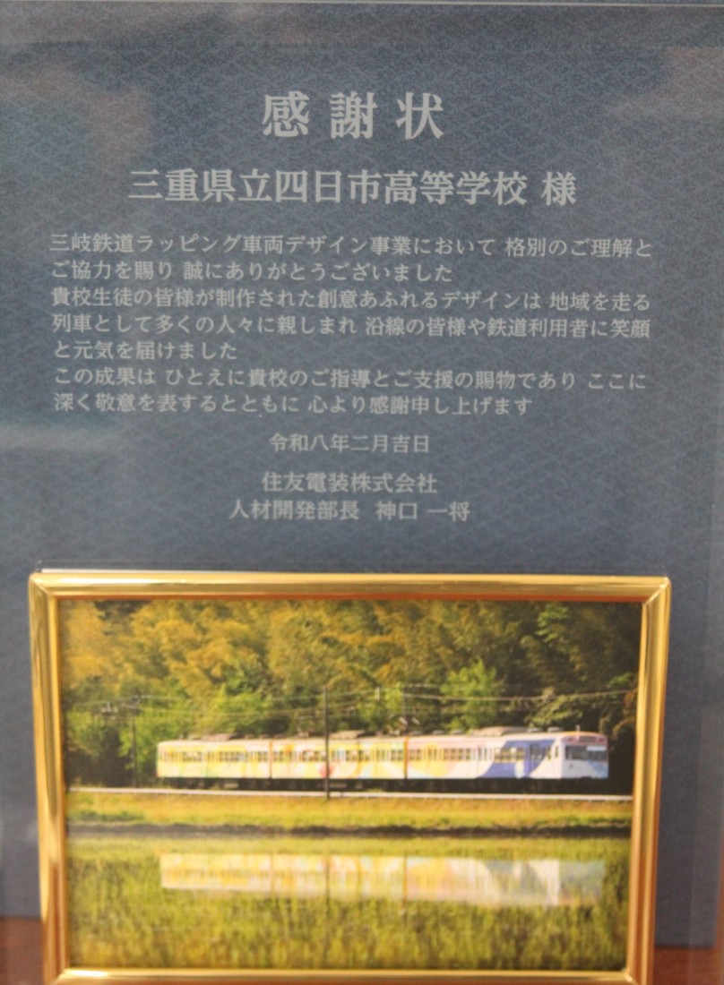 次に本校3年生2名がデザインを描いたラッピング電車が3月末で運行を終了することに際し、プロジェクトの主体となった住友電装株式会社さまより記念品を贈呈していただきました。