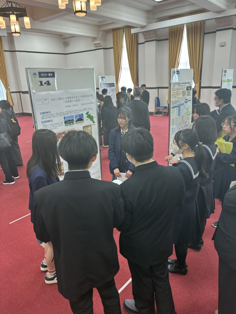 本校生徒は「自然と調和する寝殿造が生んだ経済波及効果〜美意識から経済へ〜」をテーマに発表しました。文献調査に加え、平等院鳳凰堂や京都御所の見学で得た知見をもとに、庭園整備や建築、儀式などが多くの職能や産業を支え、当時の経済活動に影響を与えていた可能性について考察しました。発表では多くの質問や助言を受け、研究を深める貴重な機会となりました。参加生徒は「全国の高校生と意見交換ができ、大変有意義な経験となりました」と感想を述べていました。