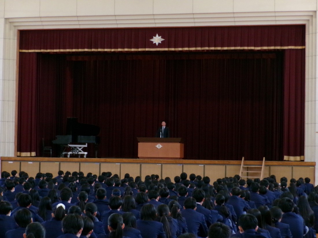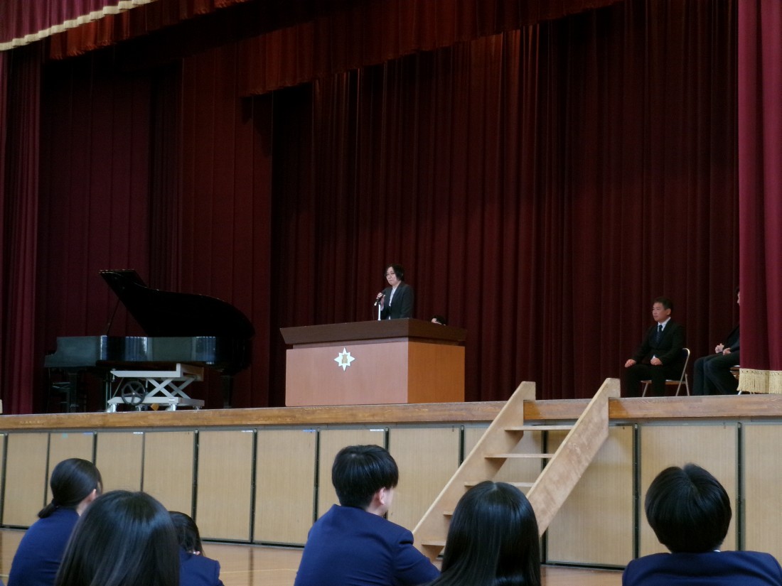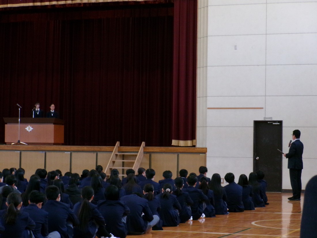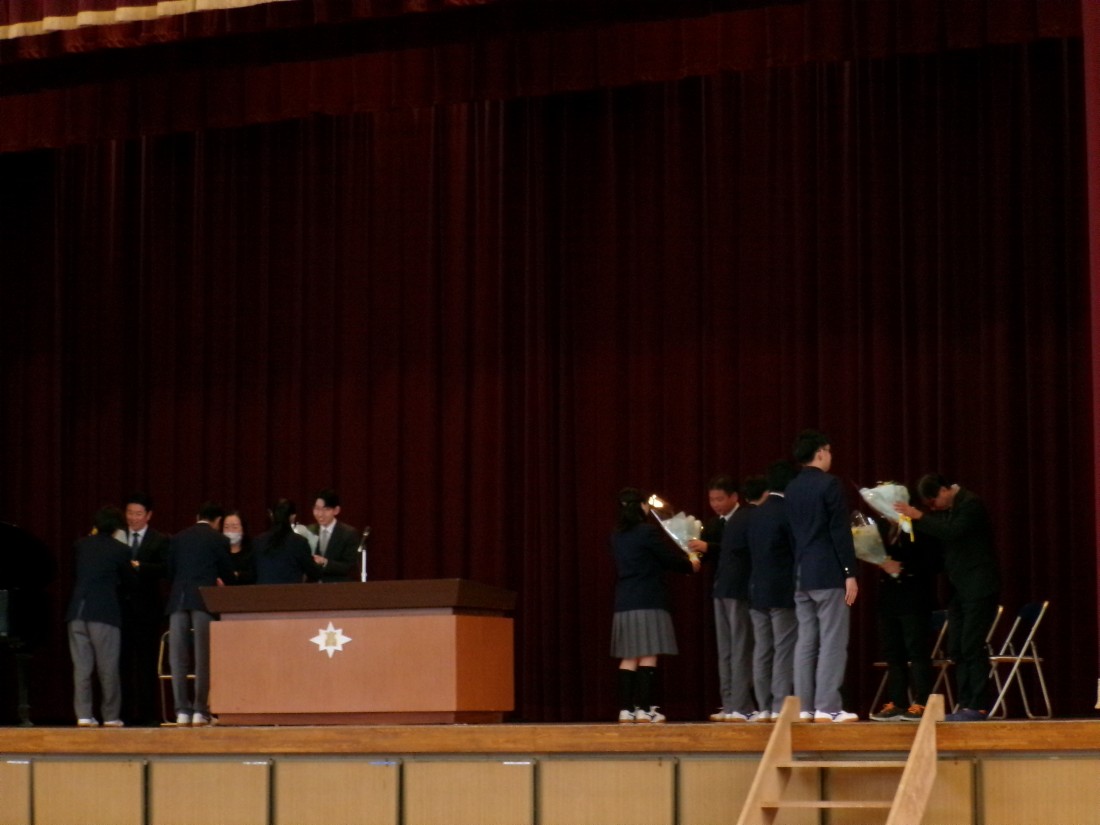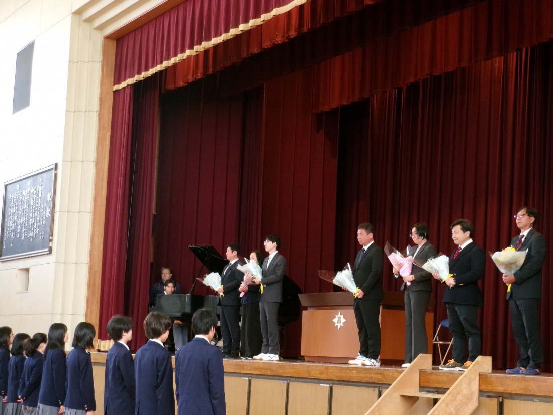離任式では、離任される各先生方からお話があり、生徒会からお世話になった先生方へ感謝の気持ちを込めてお花を手渡し、音楽部の伴奏と歌を筆頭に全校生徒が校歌でお世話になった先生方をお送りしました。