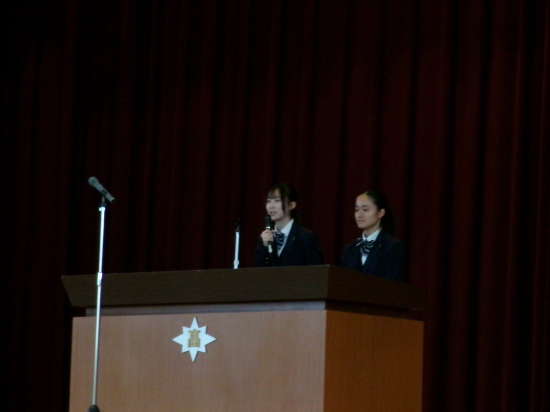 続いての壮行会では、第38回中部日本個人・重奏コンテスト三重県大会高等学校個人の部オーボエで金賞を受賞した吹奏楽部の山本さん、吉岡さんへ向けて校長、生徒会長より激励のメッセージを送りました。3月27日(金)に滋賀県で行われる、第38回中部日本個人・重奏コンテスト本大会オーボエ独奏に出場します。