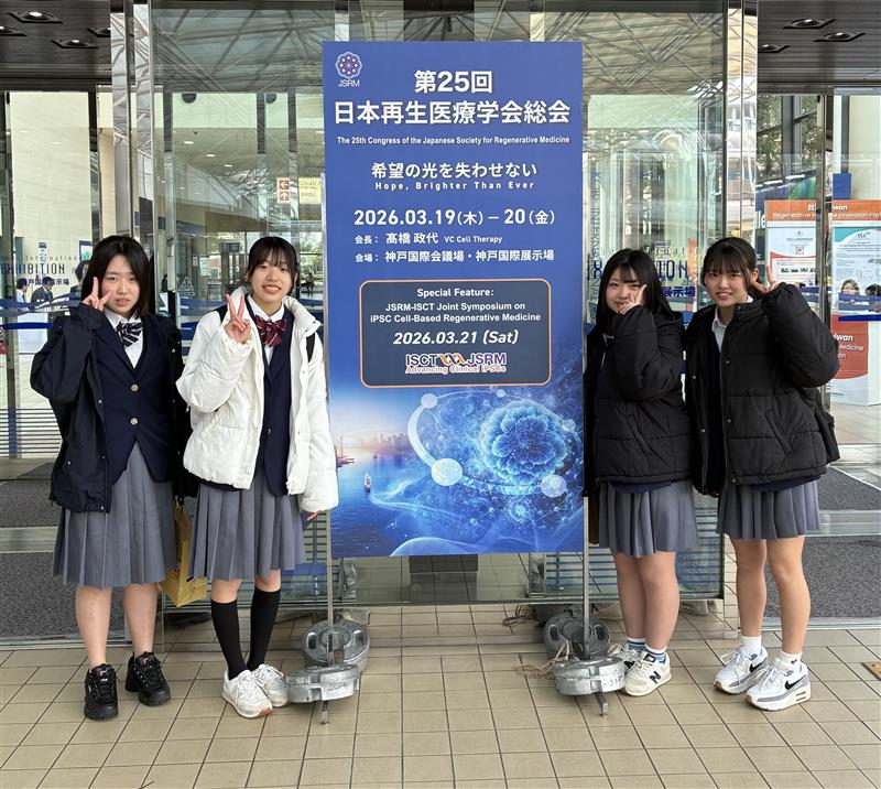 3月20日(金)、神戸国際展示場で開催された日本再生医療学会「中高生のためのセッションアドバンストコース」に本校生徒が参加し、「幹細胞/再生医療研究+AI=至高のテーラーメイド医療の実現」をテーマに発表を行いました。
