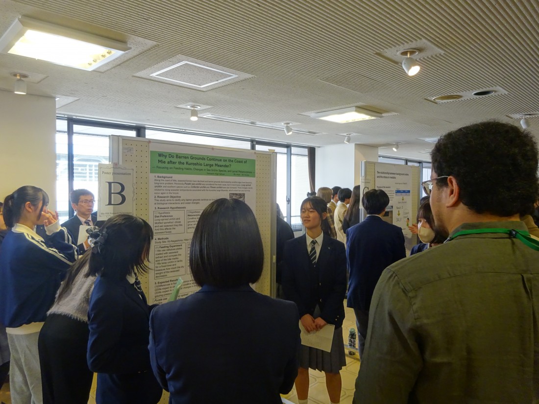 令和8年3月15日、四日市市地場産業振興センターにて、四日市高校主催のMie ScienceResearch Presentation2025を開催しました。三重県内の高校7校(四日市・桑名・川越・高田・津・松阪・伊勢)から106名の生徒たちが参加し、これまでの探究活動の成果を英語で発表しました。ポスター発表や口頭発表では、緊張しながらもオールイングリッシュで一生懸命に説明する姿が見られ、聞き手からも多くの質問が英語で出るなど、会場は和やかながらも活気にあふれていました。発表を通して互いに刺激を受け、学びの深まる機会となりました。